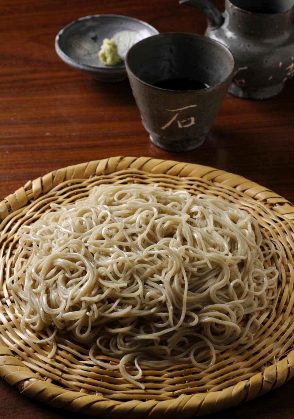 流石本店で扱う十割そばは、石臼で自家製粉した細打ちそばで、つなぎを一切使わず水だけで打っているため、繊細な喉越しとコシのある歯ごたえが特徴。合わせるつゆもメニューによって出汁とかえしを変更する徹底ぶり。鰹節は4種、醤油は約10種を使い分け、かえしも5、6種を用意する。薄口でカツオの風味がやさしい爽やかな味わいが特徴的。