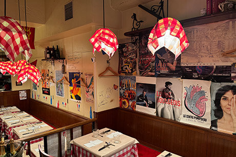 日常的に使えるフレンチの大衆食堂がコンセプト。赤と白のチェック柄のクロスやランプシェード、壁面には異国のポスターが飾られ、まるでパリの街角にある店のようだ。