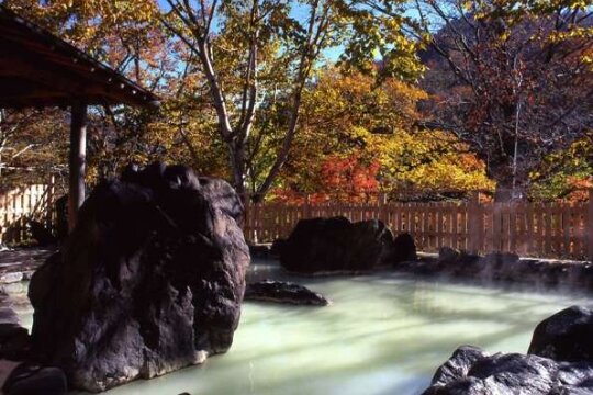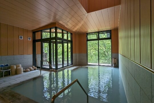 ブナやナラの原生林に囲まれた、松川温泉峡にある一軒宿。館内は、温泉の地熱により全体をじんわりと暖めているので、足先まで心地よい。日帰り入浴の利用が可能で、男女別大浴場は2024年6月にリニューアルしたばかり。湯の花が舞う乳白色の湯は硫黄泉で肌にやさしく、深部から体が温まる。混浴露天風呂や女性専用露天風呂も入浴でき、大広間では休憩だけでなく食事利用もできる。