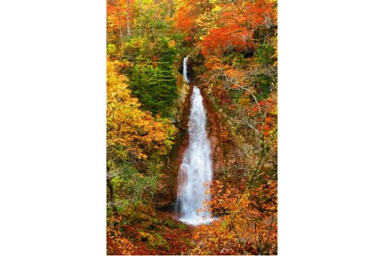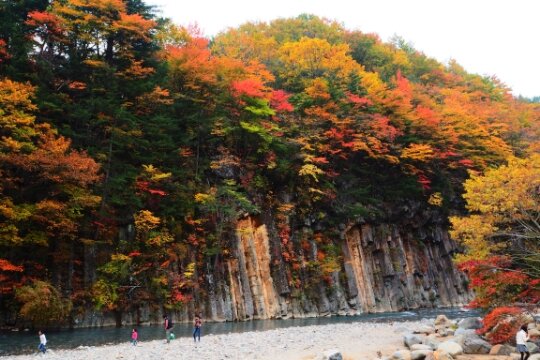 八幡平エリア屈指の紅葉名所。東八幡平から松川温泉まで続く渓谷で、ブナやナラ、カエデやモミジなどの落葉樹が多く、10月中旬から下旬になると赤やオレンジに色づいていく。なかでも森の大橋付近は、川岸の崖が柱状節理になっている松川渓谷玄武岩もあり、荒々しい崖と紅葉が鮮やかなコントラストを描く。近くの「岩手県県民の森」も紅葉が美しく、合わせてめぐるのがおすすめ。