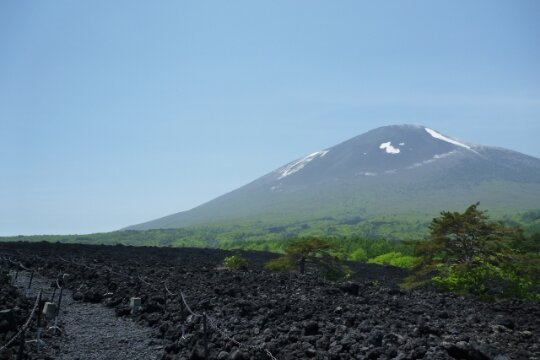 岩手山北東山腹に位置する溶岩流の跡地。1732(亨保17)年の大噴火の際に流れ出たもので、長さ約4km、幅約1.5kmもの黒い岩石帯が広がり、所要約45分の散策が可能だ。岩石帯の表面には、シラガゴケといった苔類や地衣類が生えている様子が見られることから学術的にも価値が高く、国立公園特別保護地区、国の特別天然記念物に指定されている。展望台から真っ黒な大地を一望すれば、自然の驚異を体感できる。