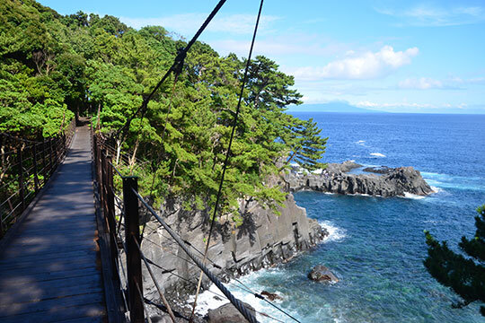 伊豆高原のシンボル・大室山が、約4000年前に噴火したときの溶岩によってできた海岸。断崖絶壁の海岸線に波が打ち寄せ、ダイナミックにしぶきを上げる。遊歩道が整備されていて、スリル満点の門脇つり橋や、伊豆七島や天城連山を望める門脇埼灯台は人気の絶景スポット。日の出が美しいポイントとしても知られる。