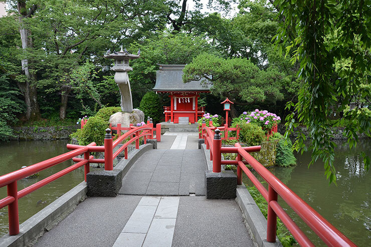 源頼朝が源氏再興を祈願し、後に鎌倉幕府を開くと社領神宝を寄進したと伝わる古社。境内には、国指定の重要文化財となっている本殿をはじめ、江戸時代に活躍した小沢派の彫刻が見事な舞殿や神門など見どころも多い。毎年3月下旬~4月中旬にかけては、見ごろを迎えた15種200本の桜が参道や神池を春色に染め上げ、参拝客を出迎える。
