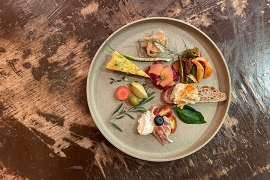 コーヒーやアルコールを楽しめるイタリアのバールスタイルの店。料理はヴィーガンをはじめ、低糖質やグルテンフリーなど多様なジャンルに対応。地場産の無農薬野菜、無添加の食材などを使うようにしている。無発酵の自家製パンをはじめ、無添加の生ハム、無農薬の野菜など7~8品を盛り合わせた「お惣菜セット」、地場産のフルーツをイタリアのスパークリングワインと合わせた「ジョイエッリ」といったこの店ならではのメニューを味わいたい。