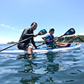 勝浦中央海岸近くのマリンスポーツ施設。4歳以上から体験できる「初めてのSUP散歩(6,900円~)」、小学生以上から参加できる「楽しいサーフィンレッスン(6,900円~)」など、親子で遊べる体験メニューを用意する。どれも専任のガイドによる指導があるので初めてのチャレンジでも安心だ。ショップやカフェも併設しているので、遊んだ後もゆっくりできる。