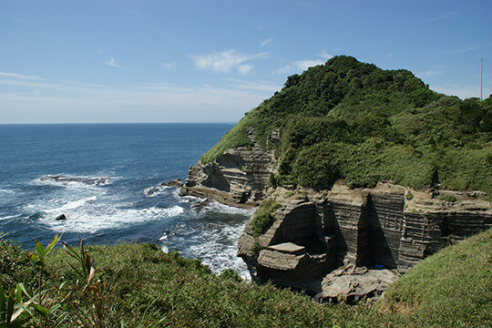 南房総国定公園に位置する、海に突き出た明神岬一帯を指す。美しい景観に恵まれた地で、大正時代初期にこの辺りを別荘地とする計画があったことから「理想郷」と呼ばれるようになった。手掘りのトンネルを抜けると、波に浸食された複雑な造形の地層が姿を現し、その先の手弱女平(たおやめだいら)の大パノラマは記念撮影スポット。所要時間は約1時間、ゆっくり進んでも約1時間30分の緩やかなハイキングコースなので、歩きやすいスニーカーで散策を楽しめる。駐車場にあるハイキングコースの案内図を参考に、歌碑や詩碑を訪ねるのも楽しい。