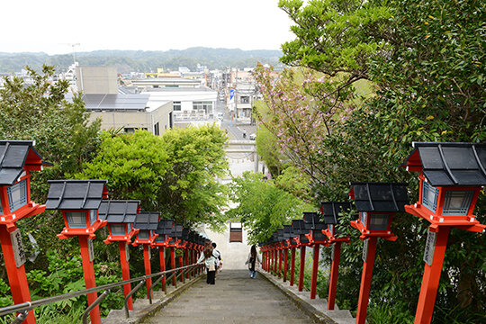 四国から房総半島に渡り、この地に技術や文化をもたらしたという「天冨命(あめのとみのみこと)」を祭る古社。神社を創建した勝占忌部(かつらいんべ)の名が、「勝浦」の地名の由来といわれている。その名前から、"勝ち占(し)める"と富と勝運を授かる神社として多くの参拝客が訪れ、「勝男(かつお)」と「金女(きんめ)」のそれぞれの魚をかたどったおみくじが評判だ。覺翁寺同様、「かつうらビッグひな祭り」の会場にもなっている。