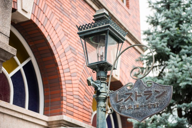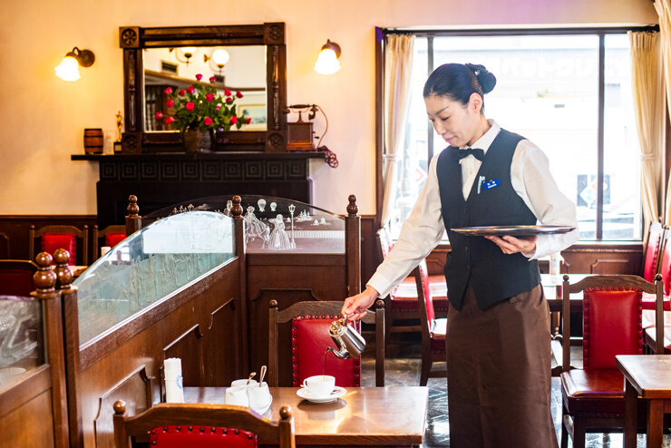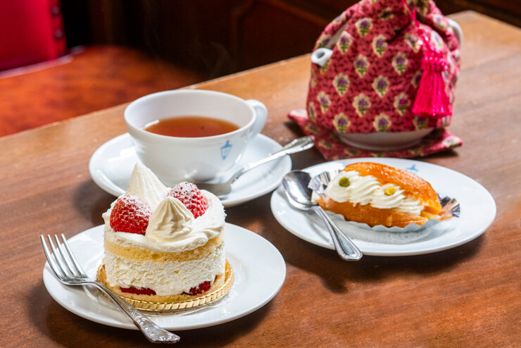 まるで明治時代の洋館のようなアーチ状のステンドグラスに重厚な家具、店先に配されたガス灯……。ゆったり流れる時間の中、ケーキや香り高いオリジナルブレンドのコーヒーを楽しもう。
