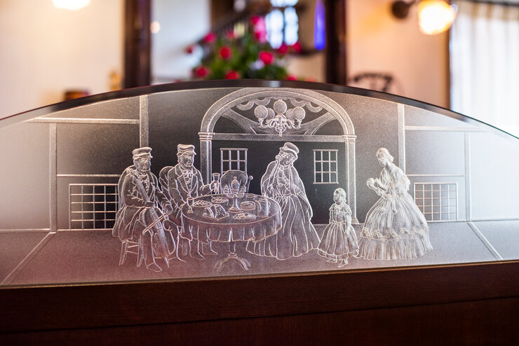 建物内は、廊下や階段にも古い写真や絵画、創設者が集めたガラスコレクションなどが飾られているほか、喫茶室以外のフロアにもバーや本格的なフレンチレストラン、結婚式や披露宴に利用できる大小の宴会場もあるので、ぜひ見て回りたい。喫茶室以外のフロアを見に行く場合はスタッフへ確認を。