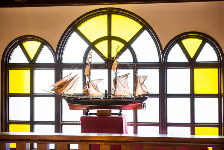 店内に一歩足を踏み入れると、吹き抜けの圧倒的な開放感が広がり、磨かれた床にはステンドグラスの光が艶やかに反射する。装飾が施された木製家具から照明、間仕切りなどの細かな調度までが、この店のためにつくられたオリジナルだ。大量生産品にはない温かみと佇まいに、補修をしながら大切に扱ってきた店の歴史を感じる。
