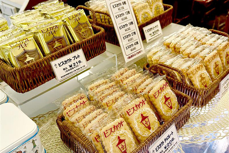 1550(天文19)年ごろ、カステラなどの西洋菓子とともに伝来したといわれるビスカウトは、厚みのあるさくさくした食感のビスケット。中にクリームを挟み、優しい味わいだ。文明開化の象徴で、店のマークにもなっているガス灯の模様が横浜らしいとお土産に人気。かわいい缶に入った詰め合わせもあり、プレゼントにも最適だ。異国情緒を感じる伝統の味を、ぜひ持ち帰ろう。