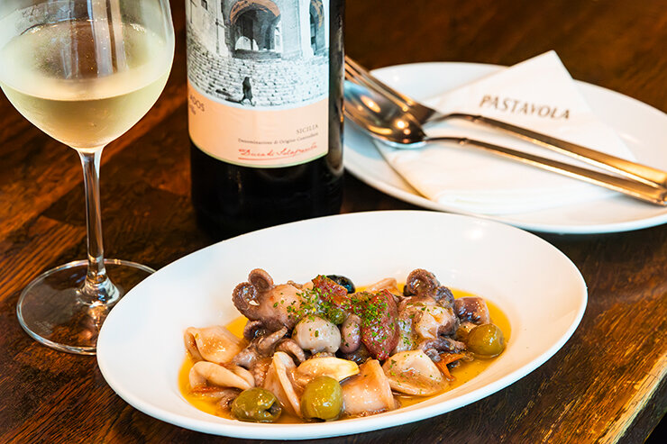 生パスタとワインが楽しめる、カウンター12席のパスタ専門店。平日のランチでは8種類のパスタメニューを提供する。青じそと小海老のペペロンチーノは、小エビのぷりっとした食感と、爽やかな青ジソの風味が調和して後を引くおいしさ。クラシック・カルボナーラは、生クリームとチーズのコクに、ブラックペッパーがアクセントを添える。平日ランチでは、プラス200円で野菜デリや焼き立てパン、プラス700円でグラスワインをセットにできる。